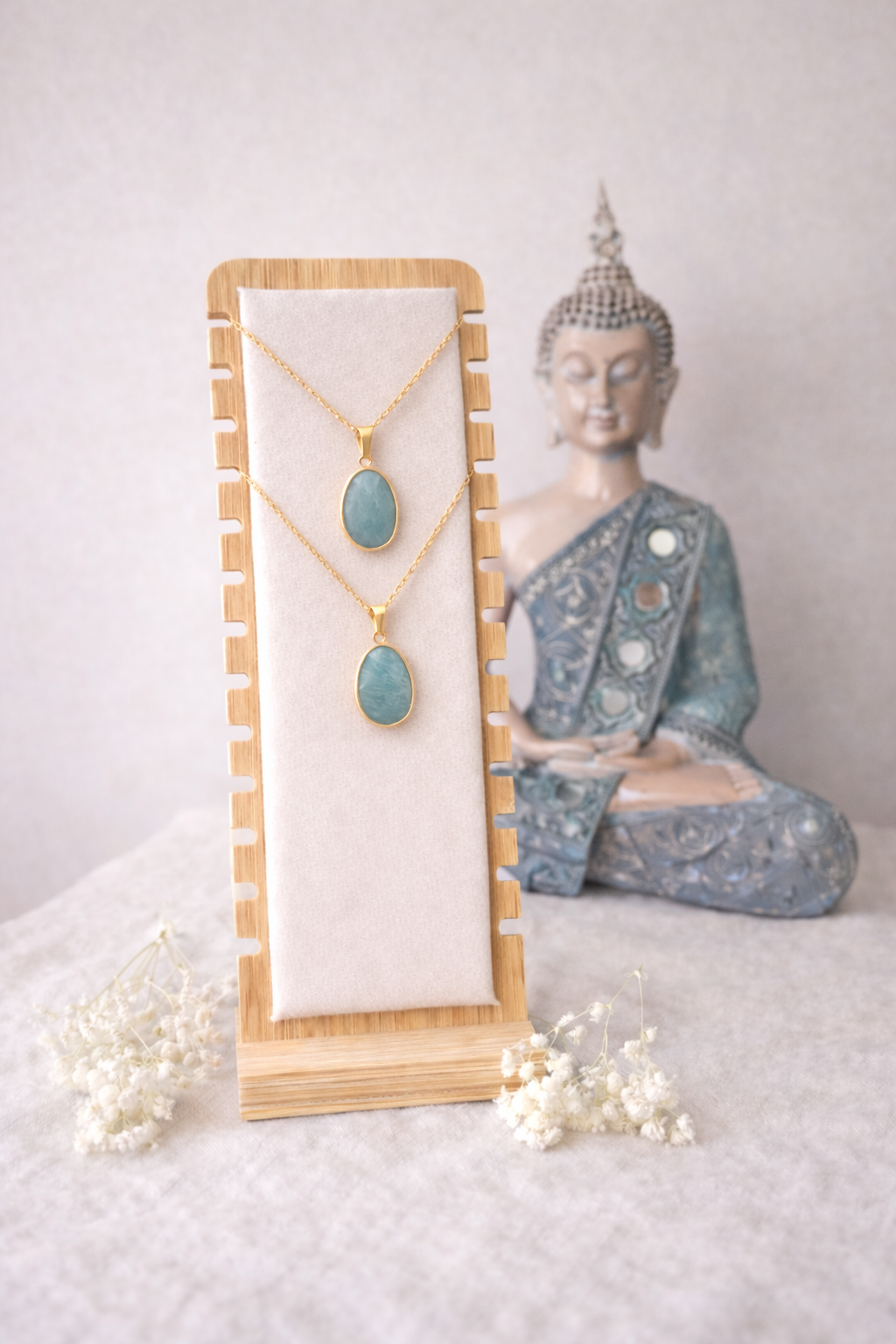 L'amazonite, pierre du chakra de la gorge, soutient une communication fluide, aide à calmer le système et contribue à harmoniser l'humeur.
